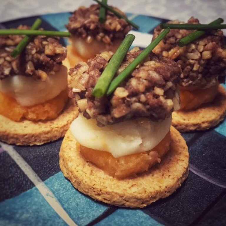 Haggis, Neeps & Tatties - Layer the haggis or vegetarian haggis with some neeps and tatties on the Mini oatcakes and serve with chutney or whisky sauce for a tatsty bite sized traditional treat.